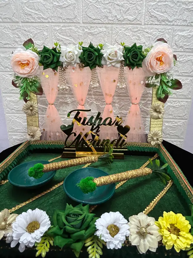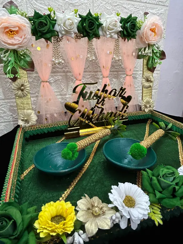 Mridang Customize Engagement Ring platter with beautiful Floral work Wood Decorative Platter (Green)