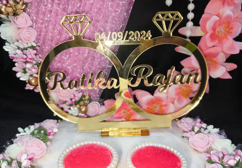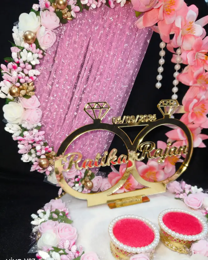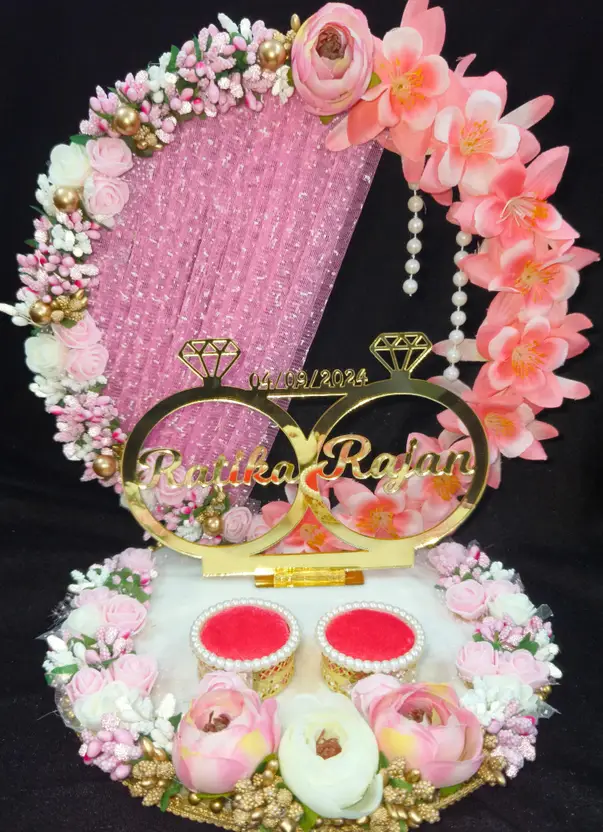 Mridang Customize Engagement Ring platter with beautiful Floral work Wood Decorative Platter (Pink)